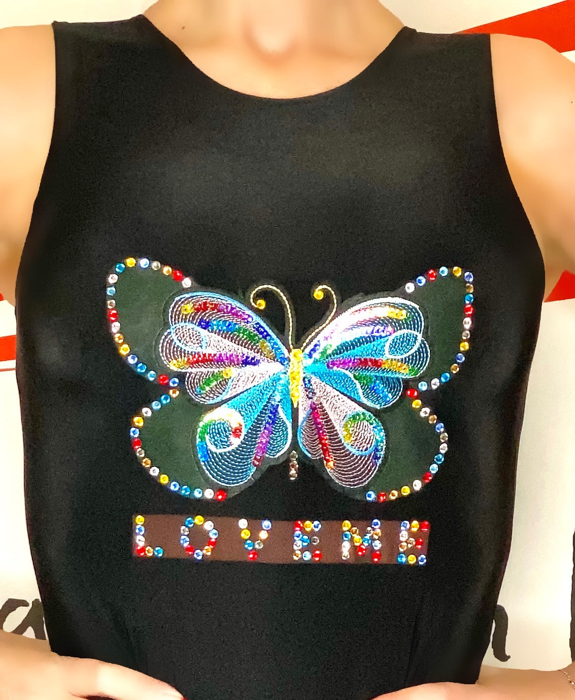 LoveMeB Black Double Layer Slinky Bodysuit with Sequin Butterfly & Crystals/ LIMITED EDITION