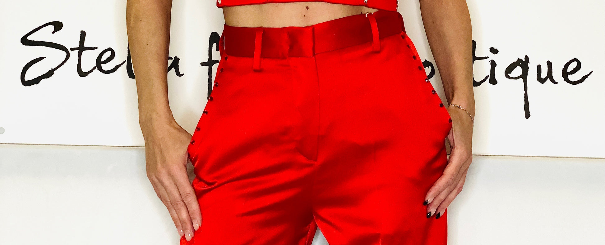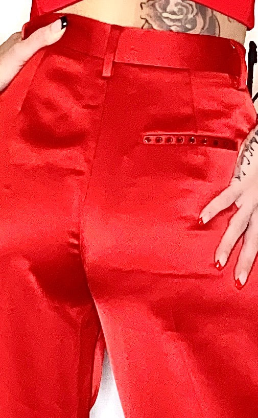 Satin, no appliqués, basic solid colour, high waisted, tapered leg, comfort fit, button closing, zipper closure, hook-and-bar, multipockets with Swarovski alternative crystals.