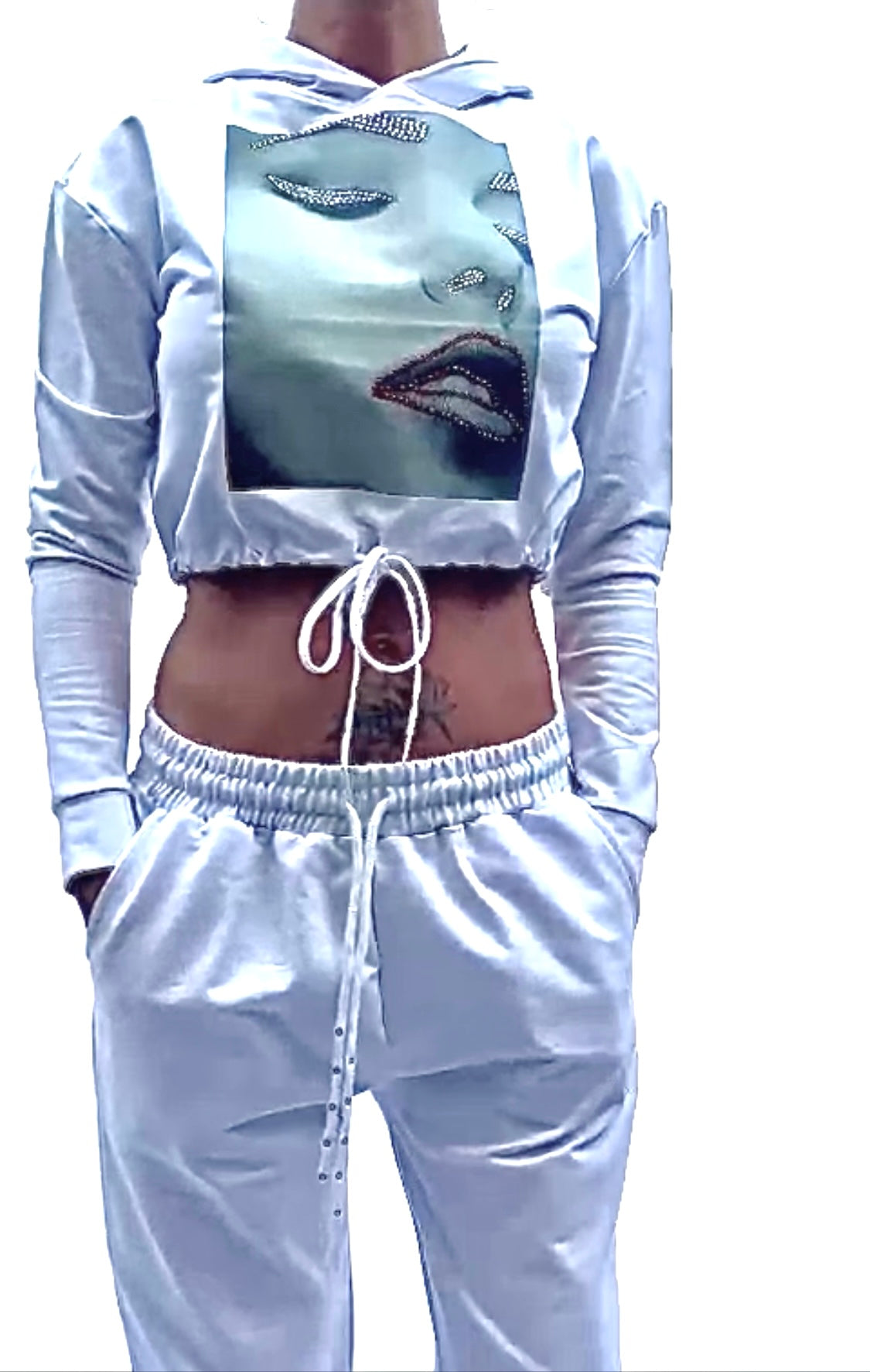 White Cropped Hoodie & Jogger Lounge Set Limited Edition Sign With Crystals